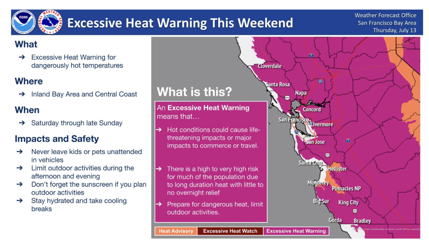 Around Town Here’s what you need to know about this weekend’s heatwave By Exedra Staff and Bay City News | July 14, 2023 Excessive heat warning, health advisories, "Spare the Air" alert, and more.