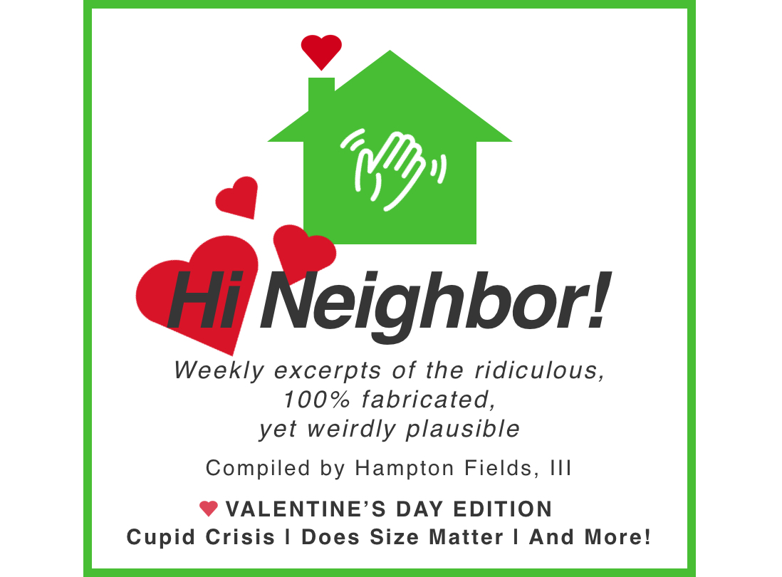 Around Town Hampton Fields, III | Hi Neighbor! (Valentine’s Day edition) By Hampton Fields, III | February 8, 2019 Valentine's Day excerpts of the ridiculous, 100% fabricated, yet weirdly plausible: Cupid Crisis, Electric Love Life, and Does Size Matter