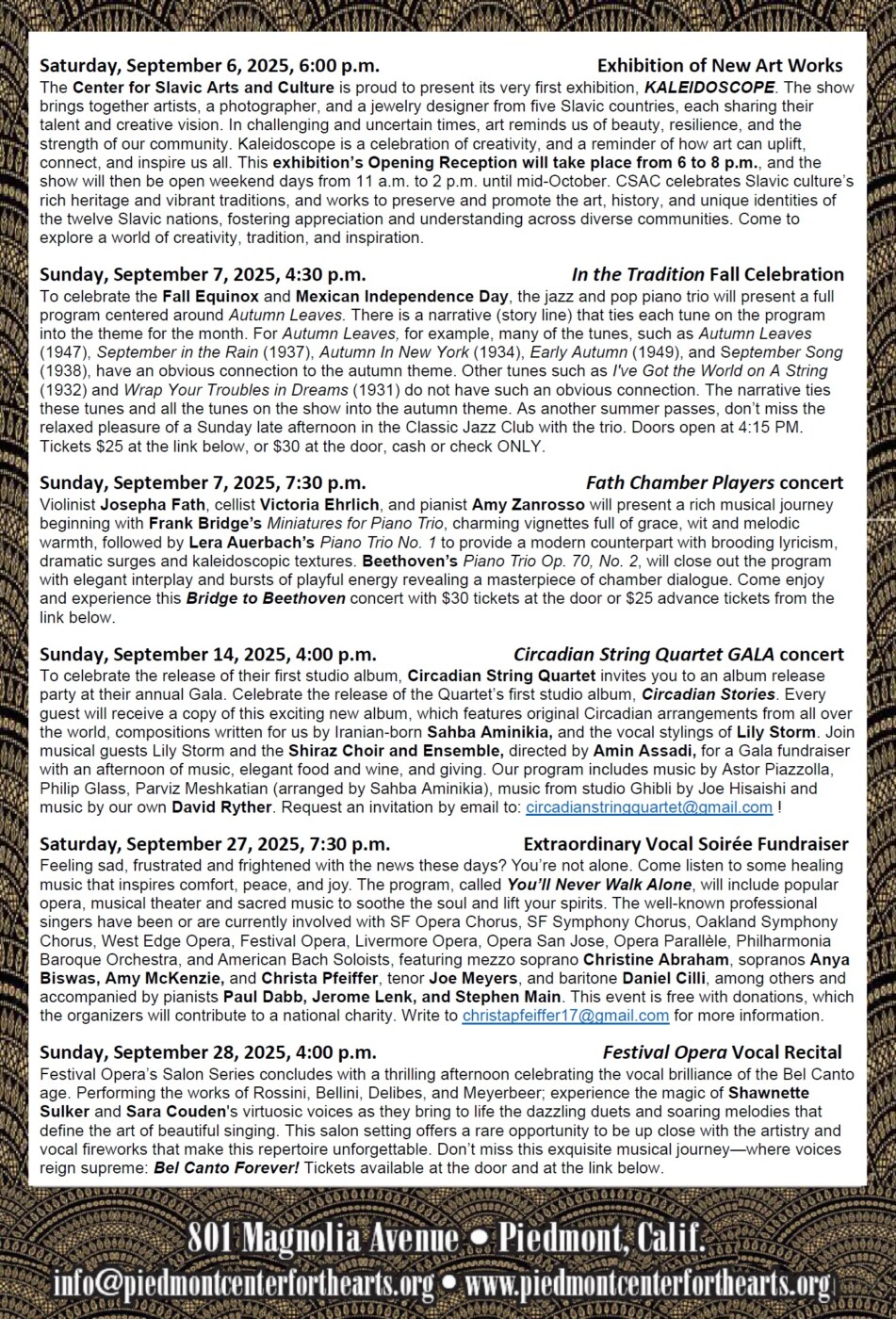 Arts & Entertainment Piedmont Center for the Arts | Slavic arts, jazz, Beethoven, opera, and more on tap for September By Exedra Staff | September 5, 2025 You needn't go far to fill your weekends with music and art.