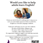 Schools Piedmont Adult School seeks volunteers to help adults learn English By Piedmont Adult School | September 19, 2025 Make a difference in someone's life. No experience required.