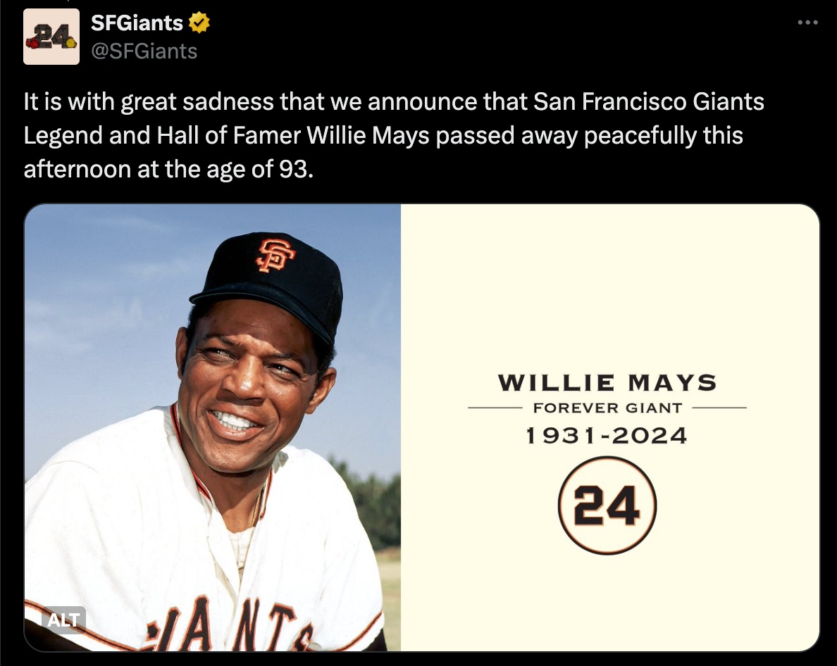 Featured in Category Giants legend Willie Mays dies at the age of 93 By Thomas Hughes | Bay City News | June 18, 2024 The Hall of Fame center fielder was one of the greatest players in the history of baseball.